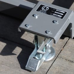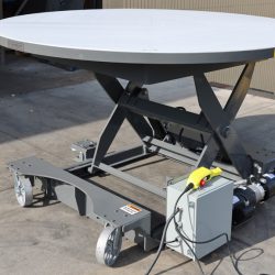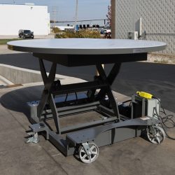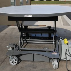 Base: Welded Steel Frame Scissor Lift. 2x Each Ø8″ Cast Iron Swivel Casters, and 2x Each Ø8″ Cast Iron Rigid Casters, 1x Foot Actuated Floor Lock