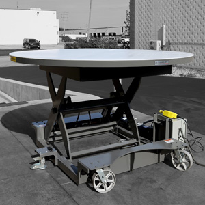 Custom Aerospace MRO Battery Powered Mobile Support Scissor Lift, Shown in Raised Position with Safety Skirt, Isometric View.