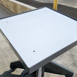 Base: 36″ Square, Formed Steel Legs and Welded Steel Frame, 2x Each Ø5″ Poly On Iron Rigid and Swivel Casters, 1x Foot Actuated Floor Lock
